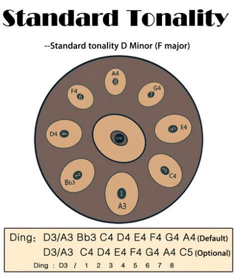 D Minor 9 notes hand pan (D3, A, Bb, C, D, E, F, G, A).Â