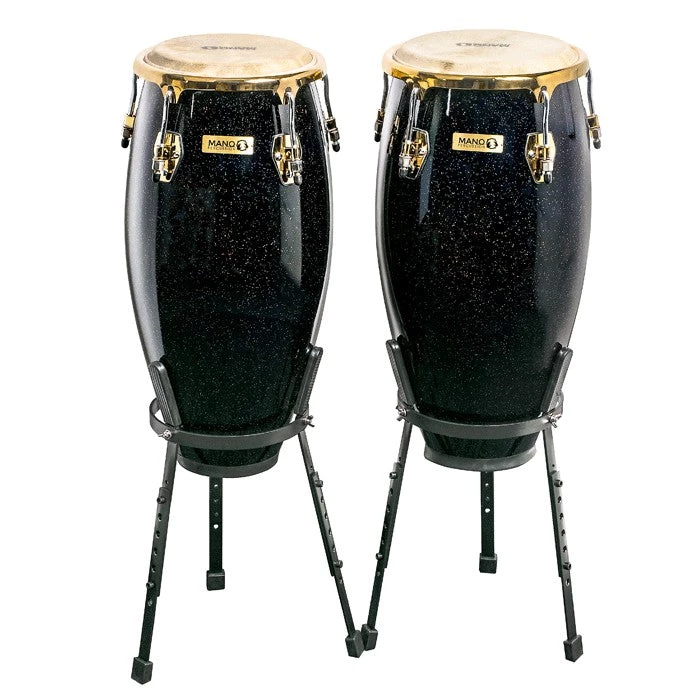 Hardwood shells, gold comfort curve rims, five gold 7.5 mm tuning lugs, gold side plates, tru skin cow heads, protective rubber base ring and height adjustable basket style stands. Gloss black sparkle.