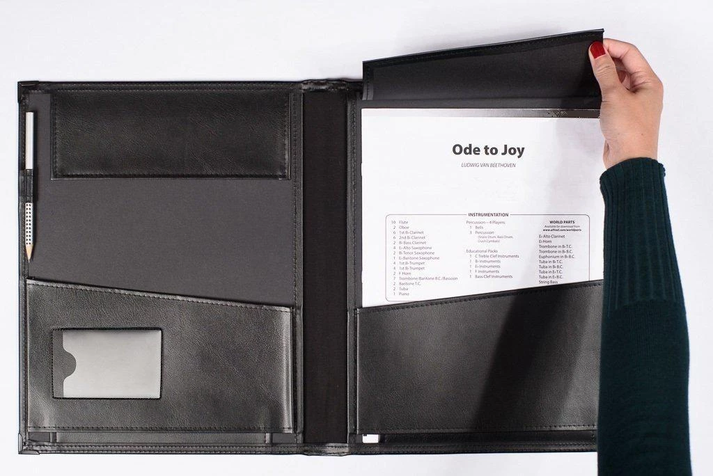 - Two fold-over flaps holding music securely during transport