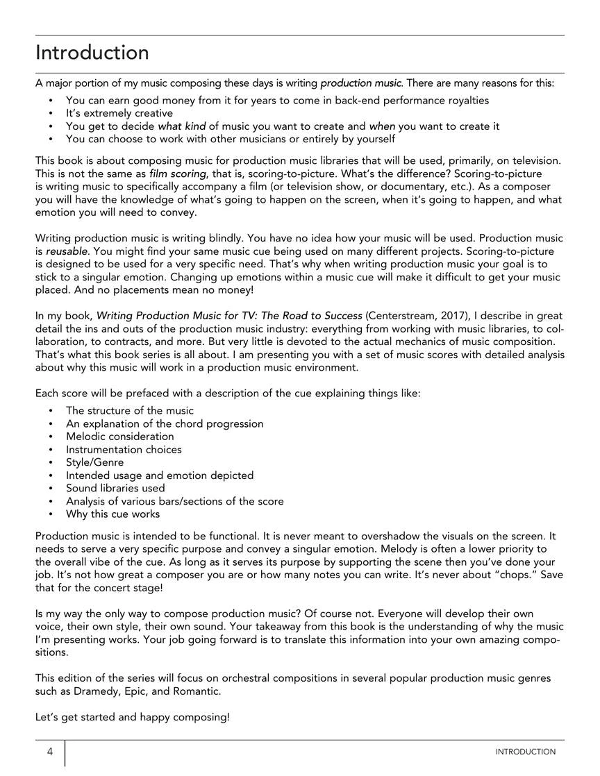 Here is a peek behind the curtains, revealing the secrets to writing successful orchestral instrumental music cues for the production music market. The reader is presented with several music cues to study and learn from. Through detailed analysis you will view complete transcriptions and hear the audio (online) of orchestral cues in multiple genres and styles. You will then have a better understanding of the structure of the music, why it works and how you can apply these tips to your own compositions. A valuable resource for anyone interested in creating production music for film and TV.