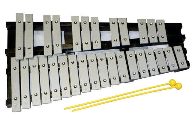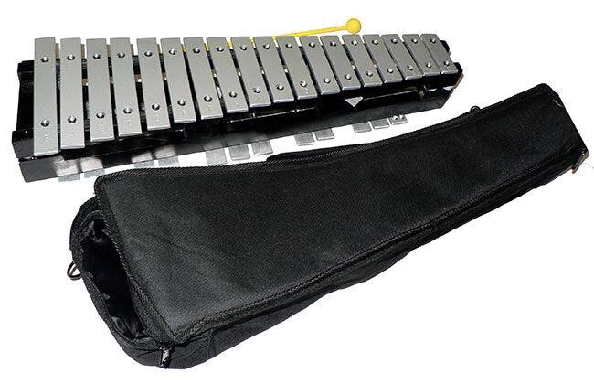 Percussion Plus 30-note glockenspiel with a black wood folding frame and natural metal coloured keys. Comes with beaters and a carrybag.