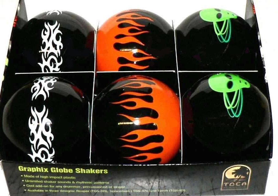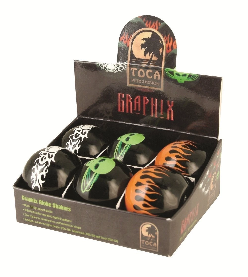 PK 6 Graphix Globe Shakers in POS Counter Display. This pack contains 2 x Torch design, 2 x Reaper design, 2 x Spaceman design. These shakers are made of high impact plastic. Unlimited shaker sounds and rhythmic patterns. Cool add-on for any drummer, percussionist or lead singer. Sphere shape with a flat end on both sides for stability. 2¼” high and 2½” wide.